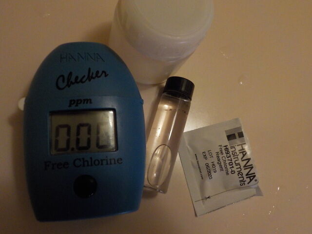2024/1/15、19時10分頃、浴槽左で試料をミニボトルで採取し、遊離残留塩素測定器で遊離残留塩素濃度を測定。