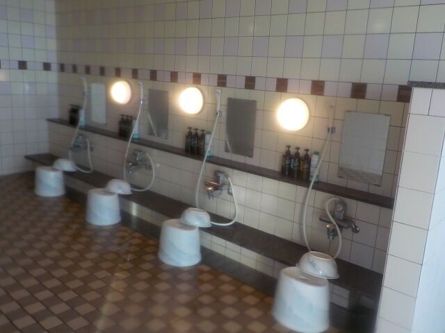 シャワー付カラン4台。シャンプー・コンディショナー・ボディソープあり。