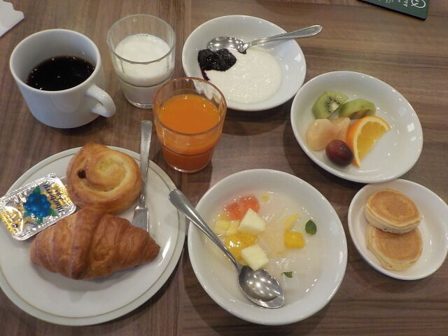 パン、ヨーグルト、シリアル、パンケーキ、フルーツ、コーヒー、ジュース、牛乳
