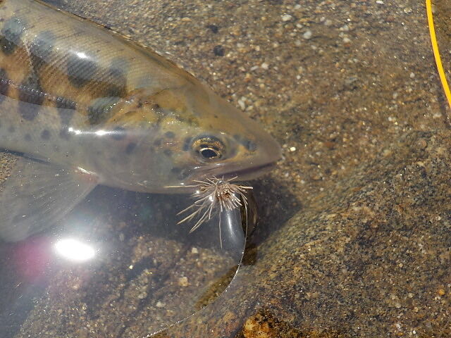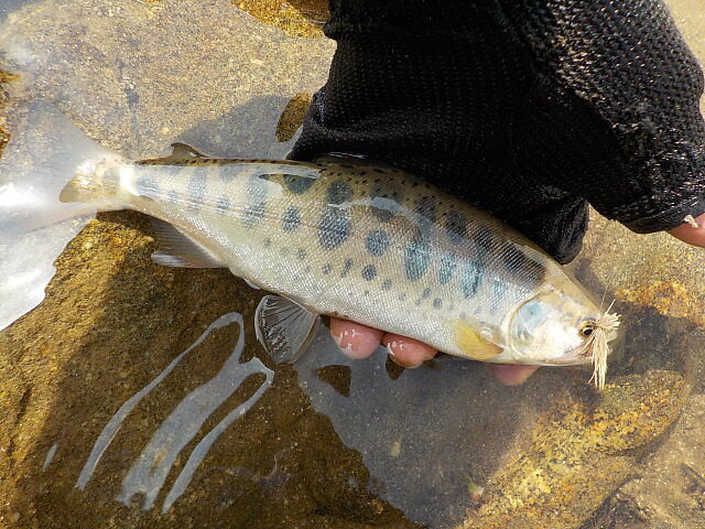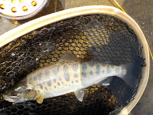 取水口があるので農業用に利用されているのかもしれない。ライズがあったので、竿を振ると35cmの虹鱒がヒットし、時間を掛けて慎重に取り込んだ。