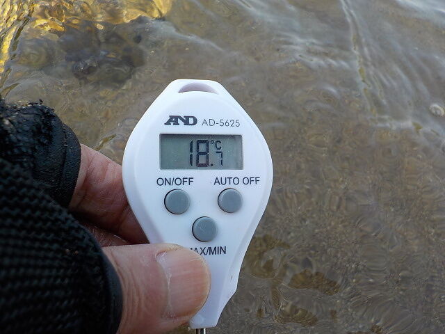 14時05分の計測で水温18.7℃。ヒットフライはエルクヘアカディス#12(TMC100)。