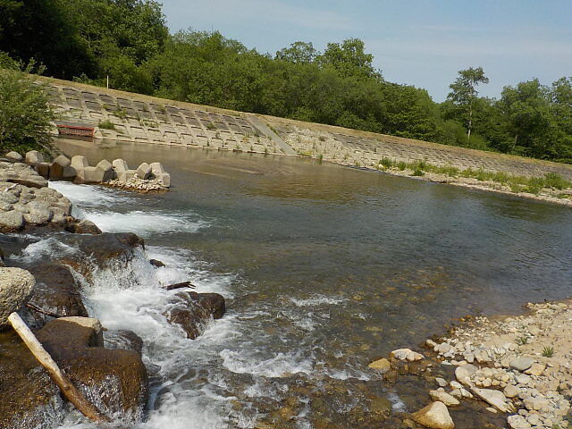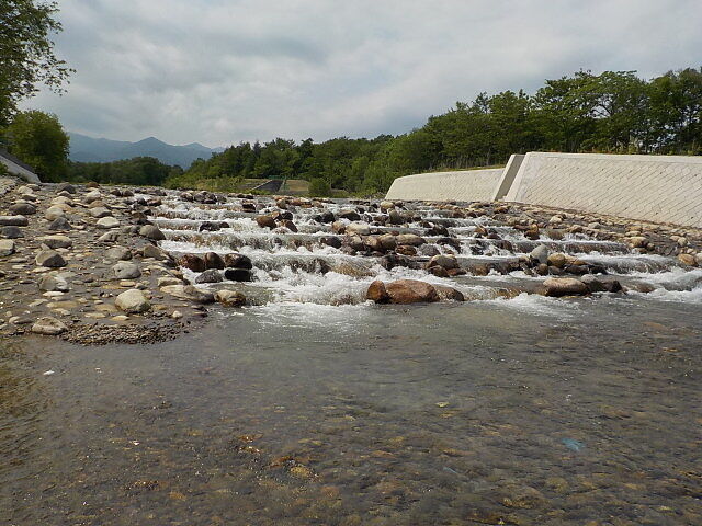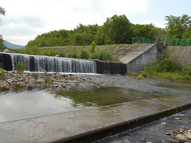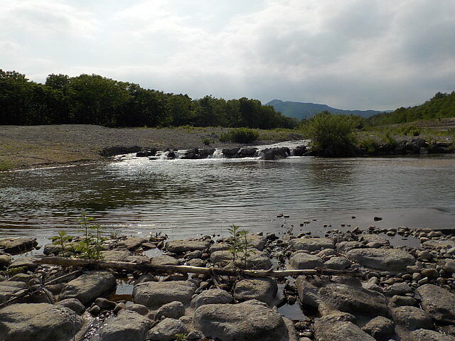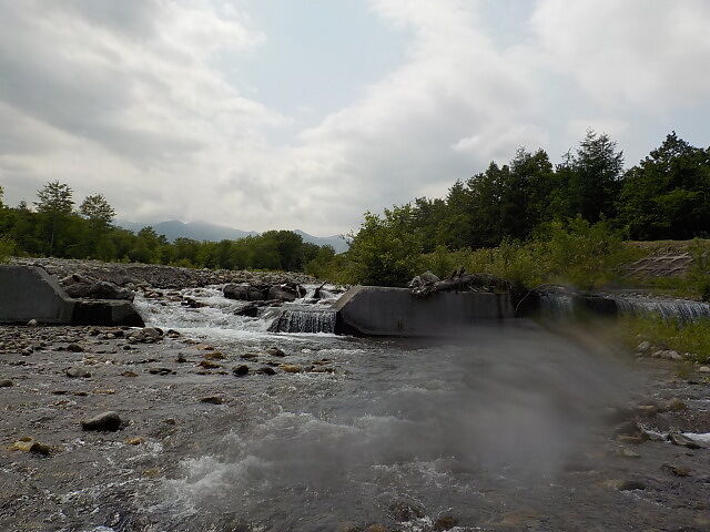 11時40分頃、旭山橋付近の護岸から入渓する。階段式落差工が設けられ、落ち込みには白泡が生じている。あまり期待しなかったが、ヤマメ数匹とミニサイズの虹鱒が水面を割って出た。