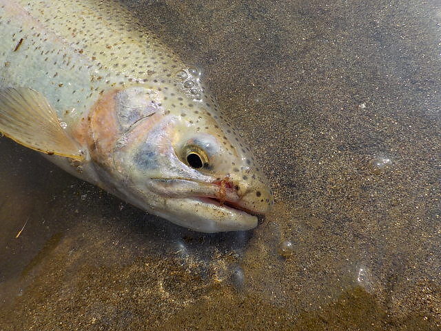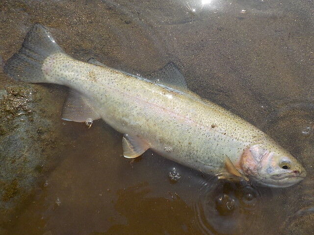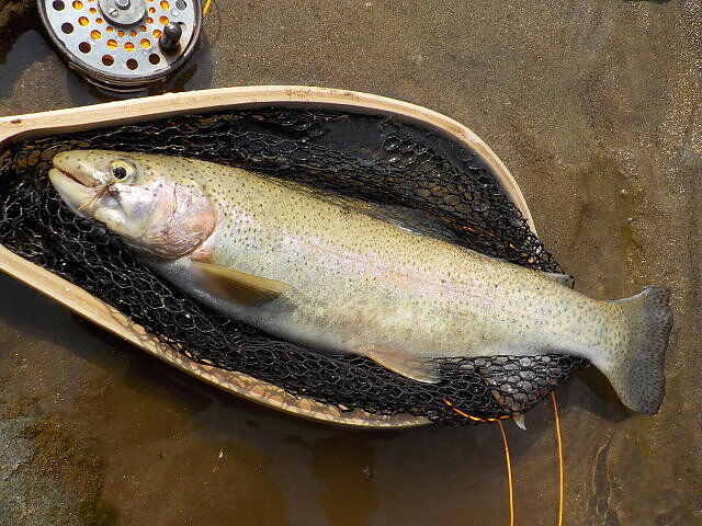 画像は35cmの虹鱒。口吻に針跡があるので、最近フッキングに遭った可能性がある。
